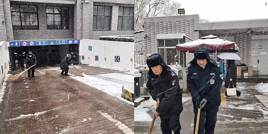 14日,先雨后雪,校园道路积雪较厚,党委保卫部立即组织除雪,保障校内道路畅通和师生安全出行。
