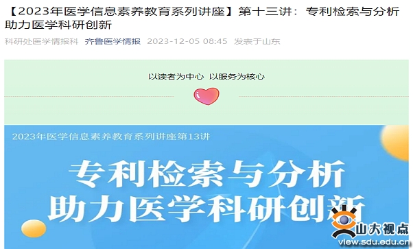 [本站讯]12月8日和12日,图书馆知识产权信息服务中心分别面向齐鲁医院教职工和新闻传播学院学生开展专利检索与分析专题线上培训讲座,专题讲座受众达400余人。