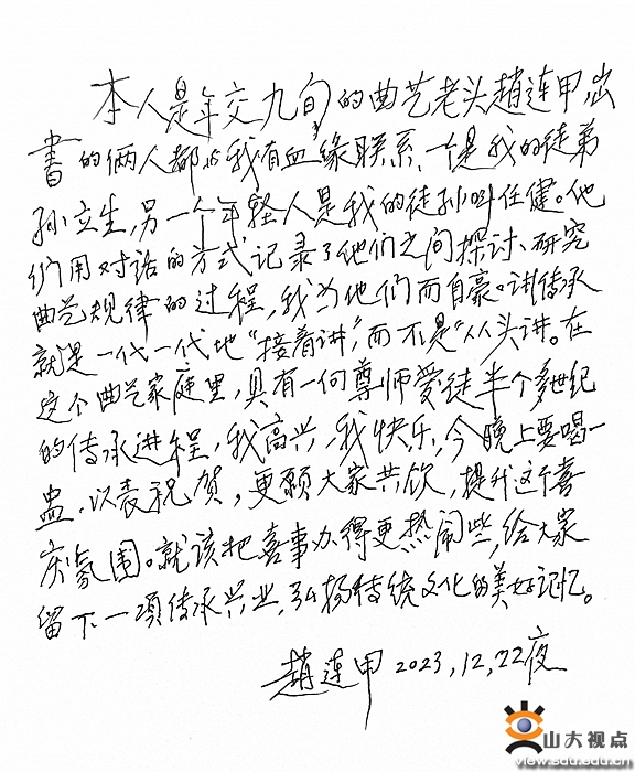 “我看了之后感触颇深,受益匪浅,该书系统总结了曲艺艺术的基本规律,令人感受到了中国曲艺的博大精深。”著名相声表演艺术家石富宽老师说道,“我建议我们的曲艺从业者都认真读一读这本书,相信一定会收获满满。”曲艺名家、90岁高龄的赵连甲先生按捺不住内心的喜悦,专门写了一封信祝贺《中国曲艺的“四梁八柱”》的出版发行。此外,王宏、石富宽、冯欣蕊、闫淑平、赵炎、唐爱国、籍薇等实力派曲艺名家也以视频的形式,对新书的出版表示祝贺。