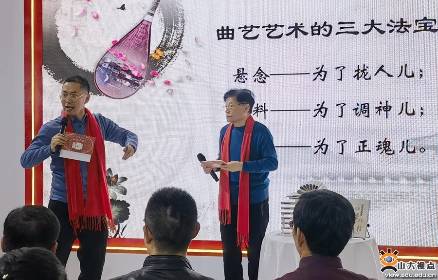 作者孙立生、任健进行了师生现场对话《中国曲艺的“四梁八柱”》,并表演了山东快书。