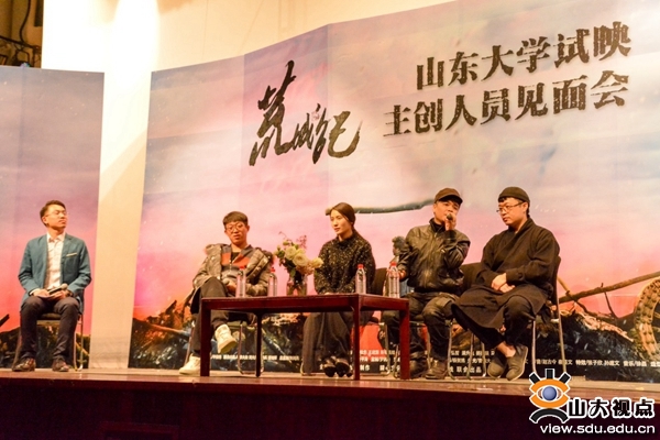 电影主要创作人员与在场师生分享了作品初衷,讲述了拍摄故事。影片讲述了民国二十四年,国民政府开展新生活文化运动的背景下,县里倡导建立“礼义廉耻堂”,急需救济粮的保长误以为县长想要为庄里的寡妇李忆莲建造祠堂,由此引发一场全族因口音误解造成的闹剧,戏剧化地呈现了一个强大的悲剧内核。导演徐啸力表示,当前中国电影市场缺少有深度和广度的作品,希望通过自己的努力探索文艺影片的思考深度与商业运作的有机结合,此次试映活动来到山东大学与观众深度互动,就是要进一步挖掘影片的深度气质和格局。电影《荒城纪》预将在2017年12月澳门国际电影节后在院线银屏上正式与观众见面。