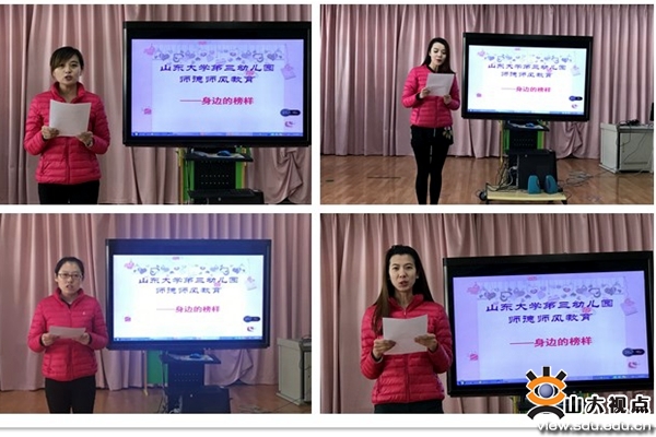 [本站讯]为进一步加强师德师风建设,提高教师职业道德水平,促进教师整体发展,营造崇尚师德的良好氛围,11月27日上午,山大三幼教师组举办了一场题为“寻找身边榜样”的师德师风演讲活动。