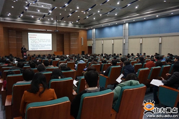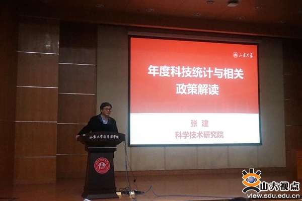 张建总结了学校2017年度科技工作情况,对有关科技指标进行了统计分析说明,对学校近期出台的《山东大学攀登计划创新团队(理工医)建设实施办法》《山东大学重大科研项目培育办法(理工医)》《山东大学重大科技成果奖励暂行办法(理工医)》《山东大学科技成果转移转化工作管理办法》四大政策进行了宣讲解读,并详细介绍了《山东大学院级单位(理工医)科研业绩评价办法》。