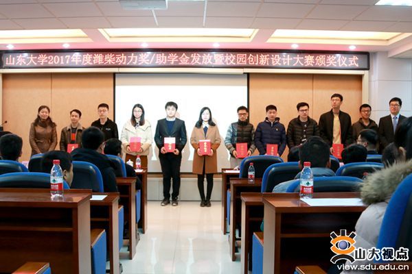 程翠玉及傅艺娜分别宣读了《山东大学关于表彰2017年度潍柴动力奖学金获得者的决定》、《山东大学关于发放2017年度潍柴动力助学金的决定》,史良君简要介绍了校园创新设计大赛的组织及评审情况并宣读了大赛获奖名单。颁奖仪式结束后,现场嘉宾同获奖及受助学生合影留念。