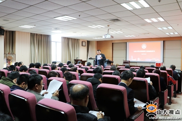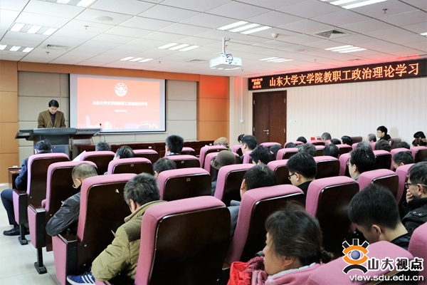 [本站讯]近日,文学院在知新楼举行新学期第一次全体教职工政治理论学习,专题传达学习党的十九届二中、三中全会精神。院长郑春、院党委副书记张帅出席会议,山大终身教授袁世硕及全体教职工参加学习。