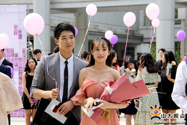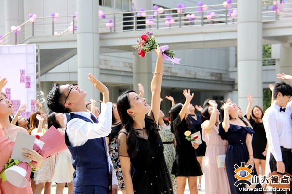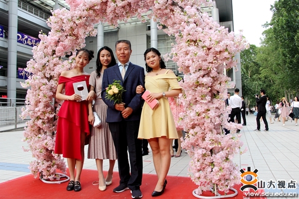 画上精致的妆容,身着典雅的礼服,毕业生们或携父母,或伴老师,或手牵挚友款款走上红毯,在背景墙下合影留念,无人机航拍留下毕业生的如花笑靥。