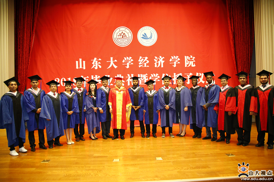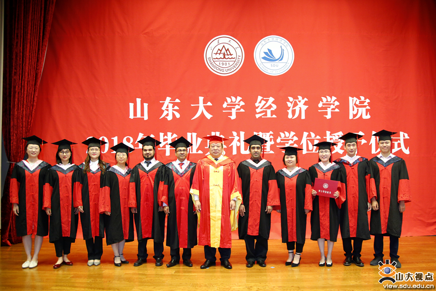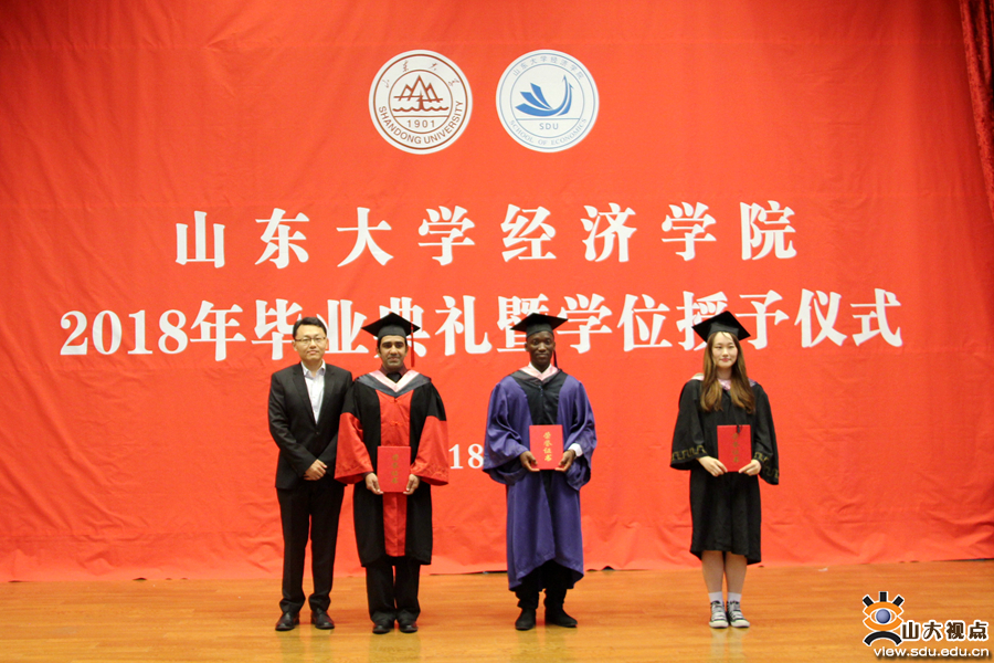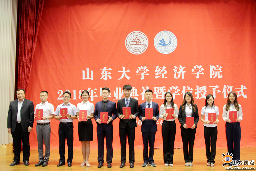 接下来,王秀丽为捐赠毕业生代表颁发毕业大礼包。余东华宣读学位授予决定。石绍宾宣读优秀毕业生表彰决定并并颁发优秀毕业生证书。王哲伟为留学生颁发山东大学经济学院优秀毕业生证书。李维林宣读校友班级理事聘用决定并颁发校友班级理事聘书。孙淑琴、马燕代表学院接受毕业生捐赠礼物。伴随着悠扬的山大校歌,曹廷求为每位毕业生颁发学位证书并合影留念。