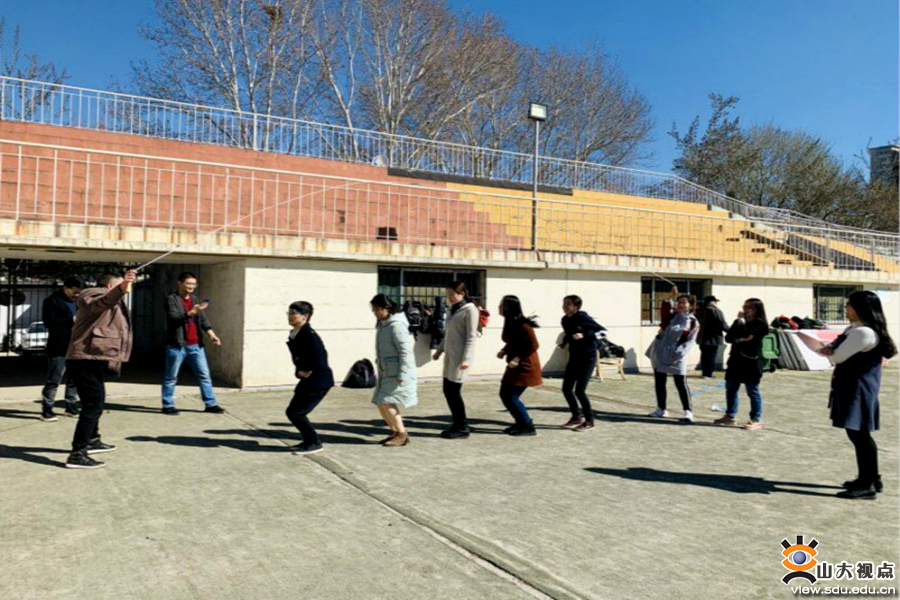 活动在上午十点展开。在班委的安排下,参与者一共分为三组,进行跳长绳、扔沙包、踢毽子三项活动,并计算总得分进行颁奖。