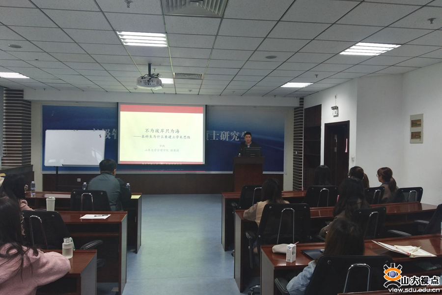 仪式后,管理学院工商管理系方政副教授以“不为彼岸只为海——本科生为什么要建立学术思维”为主题开展讲座。他从介绍自身求学背景和本科期间的学习经历入手,结合经典案例分析,提出要“建立负责任、有温度的学术思维”这一理念。他从具体的文献阅读技巧出发,强调学术研究最初便要注重逻辑思维的培育和认知边界的拓展,淡化“差不多”思维。方政鼓励所有本科生主动开展学术研究,在学习中积累学术素材,建立学术自信,为未来学术研究打下良好基础。本次讲座以本科生为对象,从引导和探索视角探讨了本科生开展学术研究的内外因,获得了到场学员的一致好评。