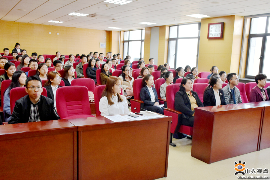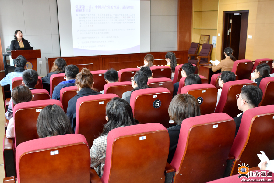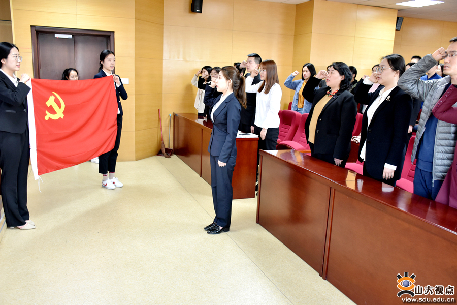 王秀丽代表学院党委讲话,表达了对新加入党组织同志的欢迎,着重强调了面向党旗宣誓的严肃性和重要性,表示每个党员都应该记住面向党旗的庄严承诺,切实遵从党章,自觉遵守党规,加强自身党性修养,传播山东大学文化,承担共产党员责任,投身于实现中华民族伟大复兴的事业中。2018下半年34位新发展党员和2019年春季党课50位学员参加活动。