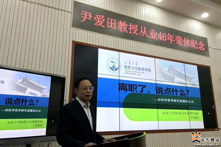 [本站讯]3月23日,医药卫生管理学院举行尹爱田教授从业46周年荣休纪念会。学院党总支书记李雨嘉主持活动,副院长孙强、全体师生以及三十余名毕业生代表参加活动。