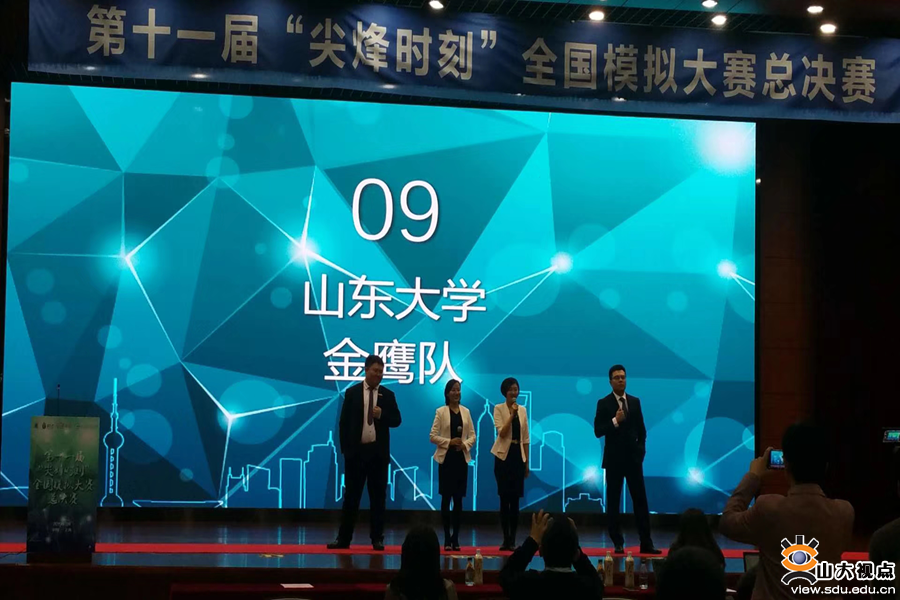 [本站讯]近日,由“尖烽时刻”大赛组委会主办的第十一届“尖烽时刻”全国商业模拟大赛总决赛在上海举行。山东大学MBA学生孙渊博、王浩、王敏、王富梅组成的山大金鹰队,在学院指导老师陈振华、包春兵、王立生的指导下,取得了MBA/研究生组全国决赛一等奖。本次比赛MBA/研究生组设特等奖1名,一等奖5名,二等奖18名。