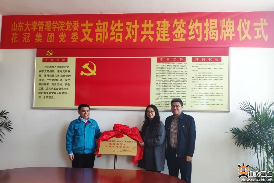 山东大学管理学院党委与花冠集团党委依托支部结对共建构建“校企党建联盟”,本着“优势互补、携手共赢”的原则,在员工培训、管理咨询、案例调研、实习基地建设等领域展开深度合作,并通过阵地联动、资源联享、支部联建、党员联管开展党建合作,进一步了提升基层党组织的创造力、凝聚力和战斗力。