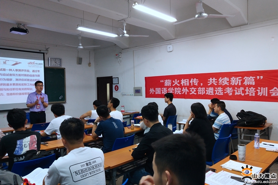 5月18日,外语学院邀请中公教育山东研究院刘浩和王成来为大家做外交部面试的培训。首先进行的是中文结构化面试的培训,刘浩从面试流程入手,在着装礼仪、思考逻辑、常见题型等多方面为大家做出了详细的介绍,并总结归纳出了面试中的自信原则与阳光原则,并建议大家要大声说、流畅说、抬头说、分条说、有感情地说。随后王成对同学们进行了外交部外语面试的培训,在知识准备、应试技巧、热点问题等方面给出了许多建议。