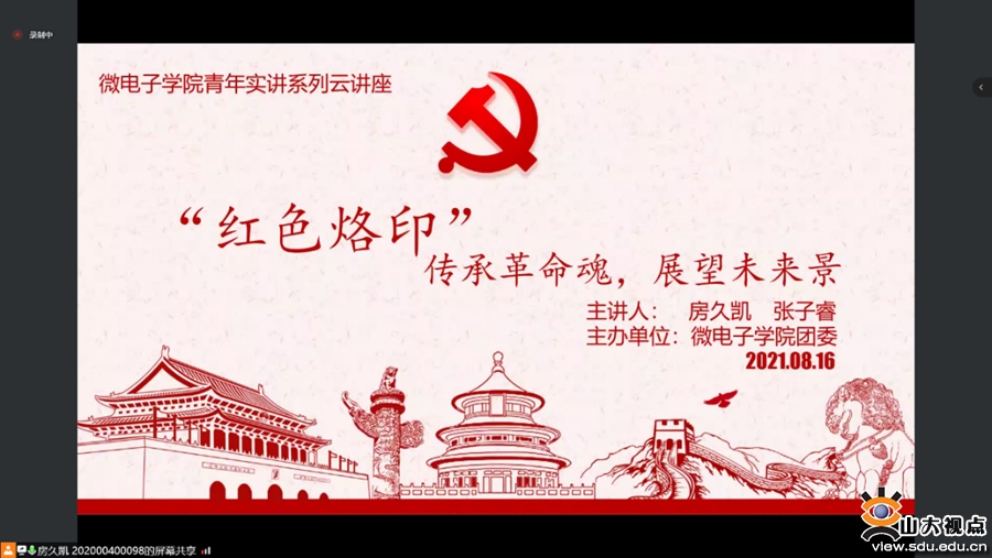传承革命魂,展望未来景。8月16日,学院举办“红色烙印”党史宣讲会。本场讲座由学院团委主办,青年团员房久凯和张子睿主讲,共计150余人线上收听。宣讲会讲述了沂蒙精神、沂蒙故事,并以此为契机进一步学习贯彻了习近平总书记在党史学习教育动员大会上的重要讲话精神,激励了与会同学以昂扬青年奋斗者的姿态迎接全面建设社会主义现代化国家新征程。