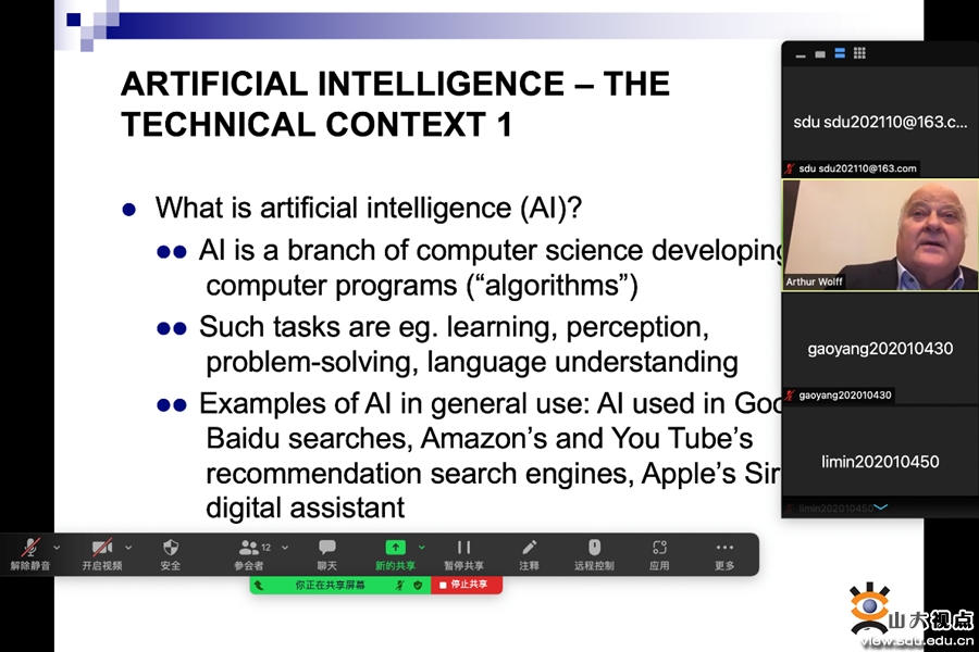 [本站讯]10月11日到10月20日,奥地利维也纳大学的Arthur Wolff教授为法学院的同学们通过线上会议平台完成了流动岗讲座,内容为Artificial Intelligence。
