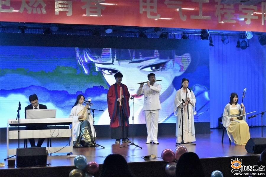 从《你要跳舞吗》的热烈开场,到山东大学街舞协会精心准备的舞蹈串烧,再到《say my name》的华丽绽放,青春的激情洋溢在律动的舞步中,一步步引燃现场的气氛。青春心语,乡音情思,横跨光年时空,点亮繁星光芒,《繁星点点》《jarrayma》《光年之外》《楚天阔》《爱如潮水》《歌曲串烧》等曲目以真挚动人的歌声唱响了学子们对生命和希望的礼赞。《离岛之歌》琴笛悠扬,《新赛马》二胡激昂,《平凡之路》《钢琴串烧》等带来了一场乐器表演盛宴,同学们的才艺此刻淋漓尽现。话剧《新白雪公主》以趣味横生的语言启迪哲思,相声表演《作茧自缚》诙谐幽默,博得阵阵掌声。