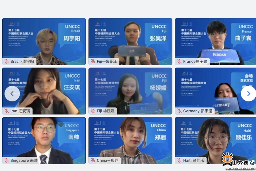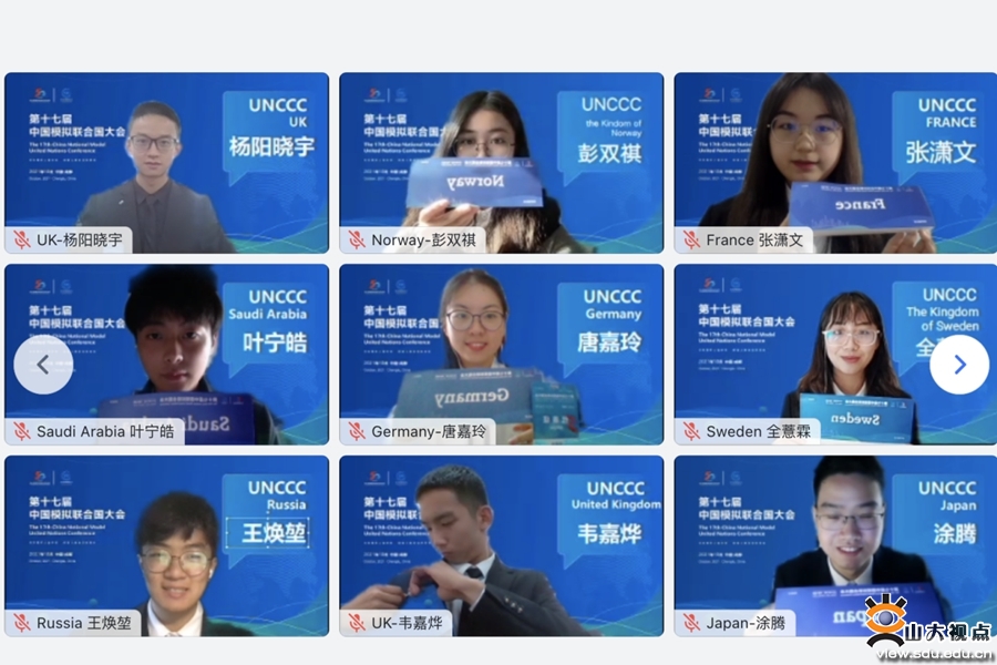 本次中国模拟联合国大会线上举行,共设5个分会场。山东大学参会的6位同学分属两个会场,张潇文和曲子寰作为法国代表、顾佳乐作为海地代表属于联合国气候大会会场;孙一昊和殷晨浠作为俄罗斯代表、孔勐勍作为沙特阿拉伯代表属于联合国开发计划署会场。