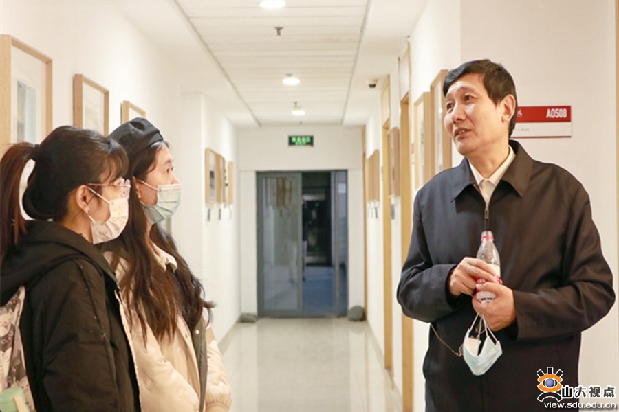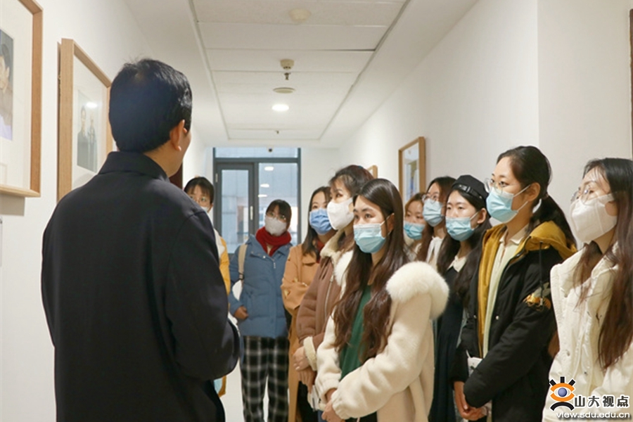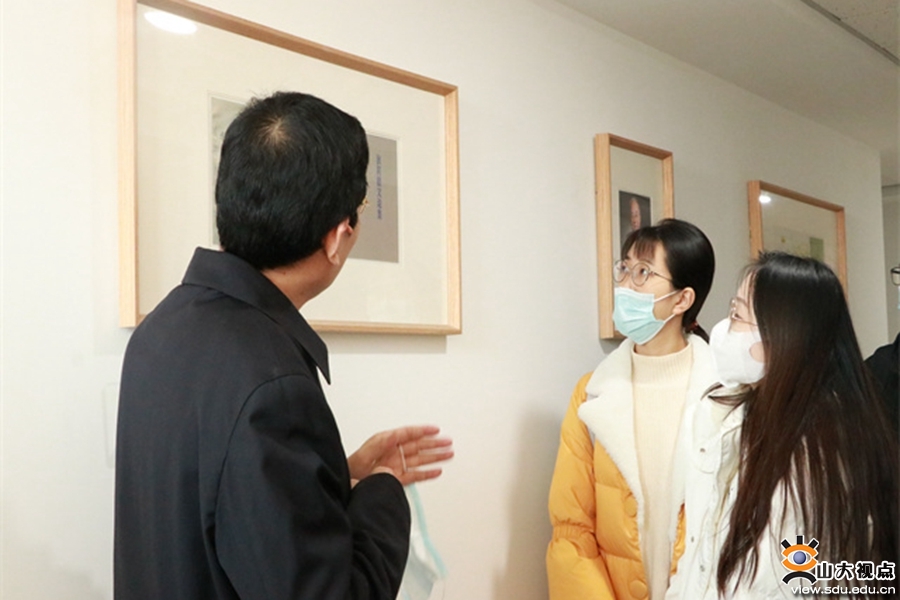 本次活动以参观知新楼A座九楼到四楼的院史展览为主线,杜泽逊向同学们介绍展现学院历史发展的相关图片。九楼院史墙的主题为“山东大学美学学科发展历史”,杜泽逊向同学们介绍了周来祥、曾繁仁两位先生的学术成就,指出了二人在美学领域的丰硕成果和卓越地位。八楼院史墙为“五岳主题展览”,“五岳”指的是学院的陆侃如、冯沅君、高亨、萧涤非、黄孝纾五位先生,展出的图片资料包括五位先生的个人生活工作照片、代表著作、手稿书信等等。杜泽逊表示,“五岳”院史墙构思精巧,布局完整,人物排列有高低错落的美感,具有极高的艺术价值与审美价值。