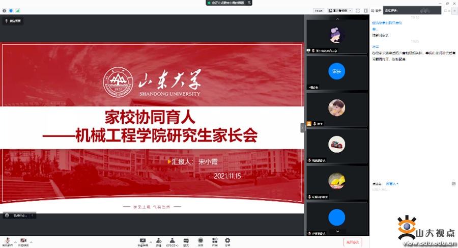 [本站讯]11月15日,机械工程学院举办以“家校协同育人”为主题的研究生线上家长会。学院团委副书记、辅导员宋小霞主持本次家长会,350余名研究生家长参与会议。