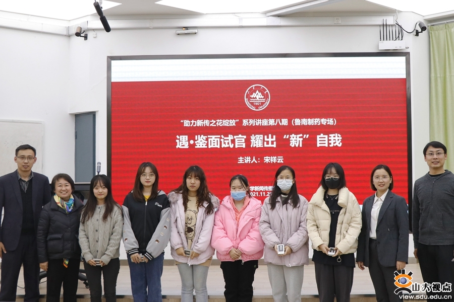 [本站讯]近日,新闻传播学院第八期助力“新传之花”绽放讲座举办。本次活动主题为“遇·鉴面试官 耀出‘新’自我”,鲁南制药集团宋祥云作为主讲人分享面试经验。鲁南制药集团代表,新闻传播学院党委副书记王丽君、2019级同学等参加活动。