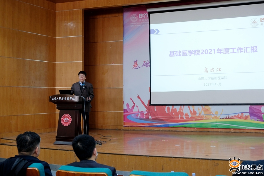 高成江代表领导班子对2021年工作情况进行了总结。他从党的建设、人才队伍建设、教学、科研、思政、交流合作、三全育人等多个方面分析了学院发展成效,重点介绍了学院今年的亮点工作,分析了学院目前发展中存在的不足,明确了2022发展规划。他表示,2021年是山东大学建校120周年、中国共产党成立100周年,学院今年各项工作取得了新的突破,这得益于全院师生的共同努力。下一步,将聚焦学院“十四五”发展规划推进、文化品牌建设、学术振兴、人才引育、学科现代化建设、人才培养等工作,推动学院各项工作落地见效。