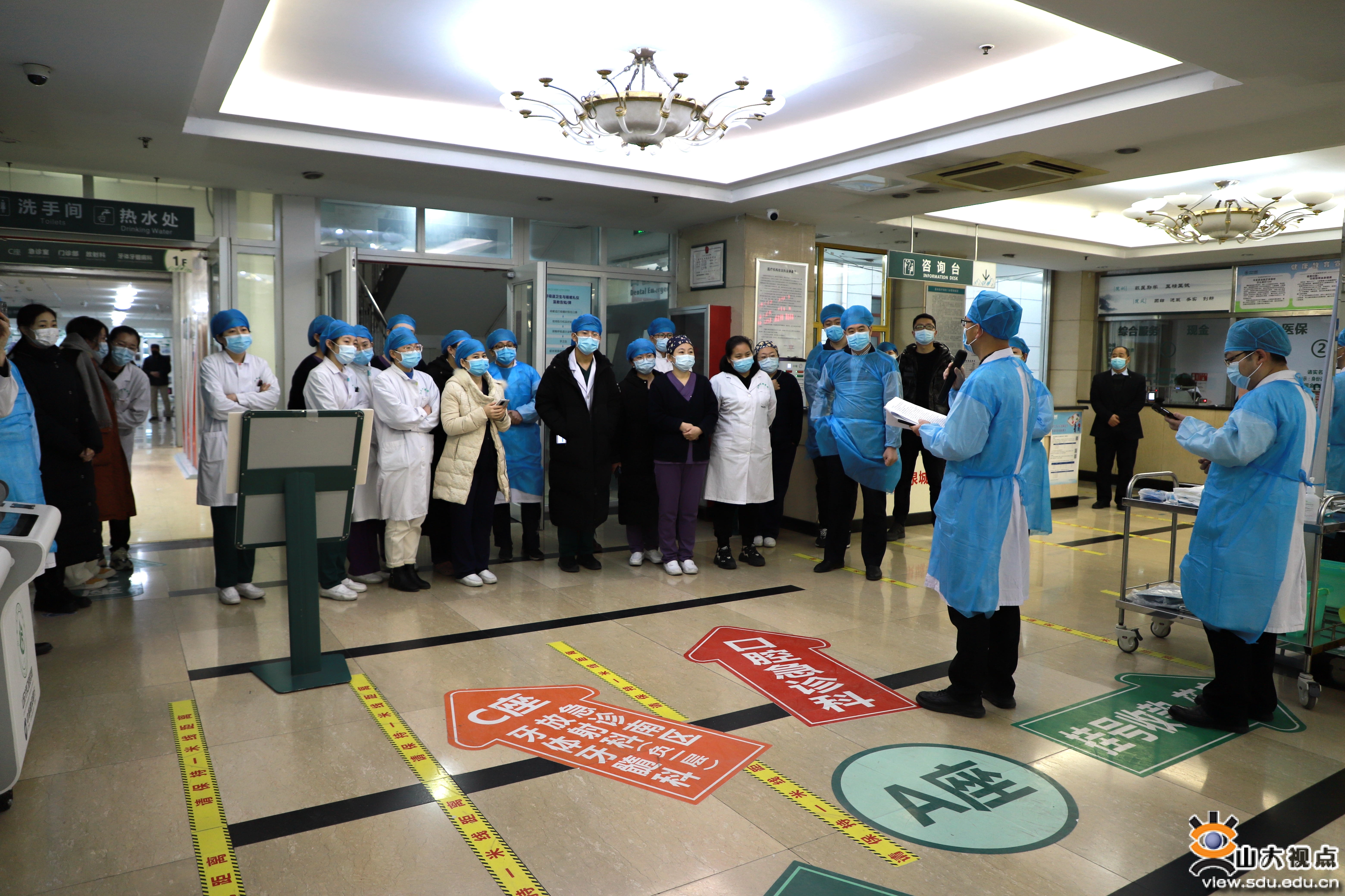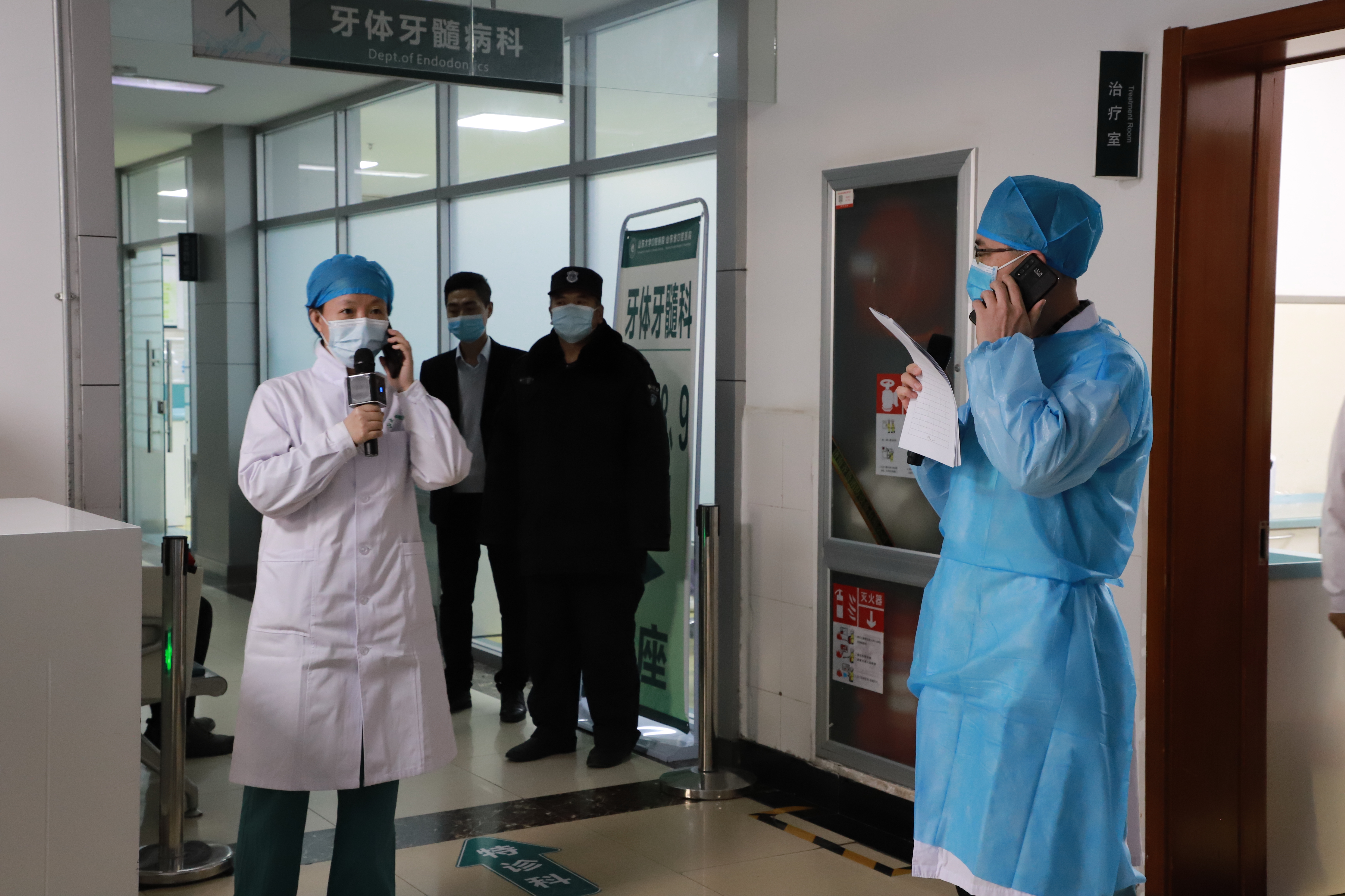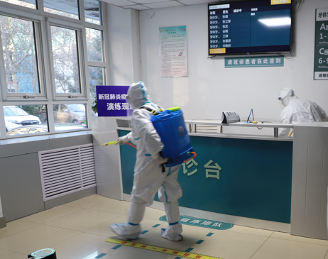 本次演练,通过“我院牙体牙髓科室预检分诊处发现一名发热患者,通过闭环管理护送至山东大学齐鲁医院发热门诊后,新冠病毒核酸检测结果呈阳性”这一假设事件进行了一系列模拟应急处置,演练过程包括发现发热患者、患者转运、情况报告、风险预判、医疗物资调用、落实管控措施、医用防护服穿脱示范、现场消杀等27个场景。