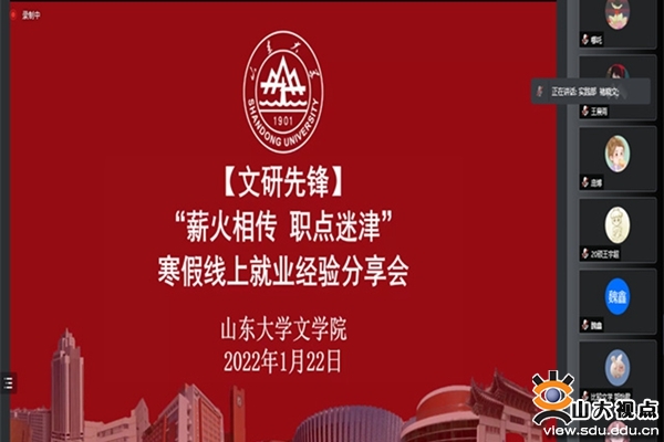 [本站讯]为引导研究生同学充分了解当前就业形势,合理规划职业生涯,文学院研究生会于1月22日上午举办了“薪火相传,职点迷津”研究生寒假线上就业经验分享会,特邀文学院2018级优秀硕士毕业生李彤和刘若凡向同学们分享就业经验。本次活动由研究生会实践部主办,实践部干事褚晓文主持,百余名研究生、本科生参与。
