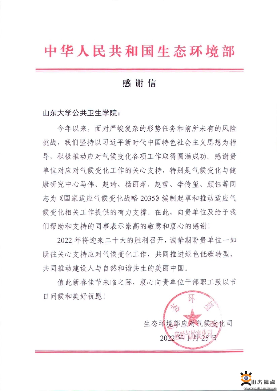 [本站讯]近日,公共卫生学院收到来自生态环境部的感谢信,信中对学院教师和学生为《国家适应气候变化战略2035》编制起草和推动适应气候变化相关工作提供的有力支撑表示感谢。