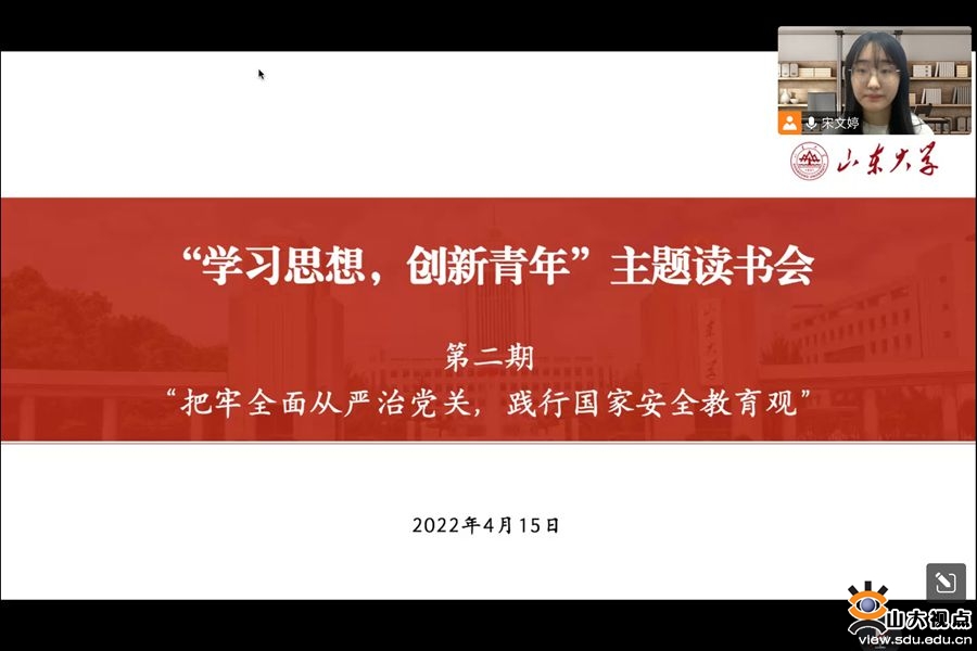 文学院本科生党支部副书记宋文婷主持活动并作小结。她呼吁学生党员要贯彻落实习近平法治思想的重要指示精神,提高政治站位,增强忧患意识,为迎接党的二十大作出自己的贡献。本次读书会为文学院和法学院党支部成员学习习近平新时代中国特色社会主义思想提供了学科交流与互学共建的平台,对青年党员理解从严治党与国家安全教育观具有重要启示。