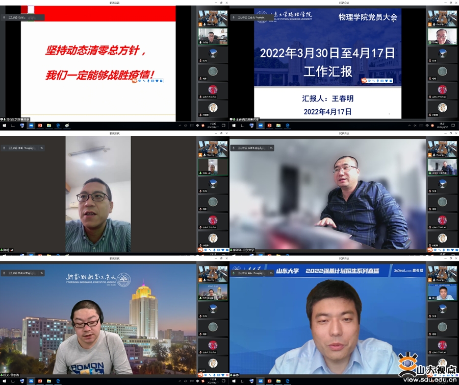 会上,原子与分子研究所所长、党支部副书记马衍东教授分享了自己驻校期间的学习、教学、科研和生活情况,表达了干事创业热情不减的激情、科研保质保量推进的责任担当以及战疫必胜的信心。凝聚态党支部副书记王春明教授介绍了本支部的理论学习情况,特别报告了荣获山东省自然科学一等奖并由山东电视台报道的仝殿民教授在量子信息领域取得的成绩,以身边人的事迹激励大家强院兴校的自觉意识与坚定信念。光电所党支部书记陈明研究员着重介绍了实验室运转与管理情况,他带领团队在学校封闭化管理期间搭建起校内外师生的桥梁,为正常开展实验教学与研究保驾护航。粒子党支部李洋洋教授围绕在线教学的互动性问题进行了交流与探讨。机关党支部、院办主任侯志涛介绍了学院在封闭化管理期间如何做好服务管理保障工作。校外工作组组长、副院长秦伟教授围绕如何做好本科生教学工作作了发言。学院党委副书记辛莹围绕辅导员工作从教育、管理、服务三个方面进行了交流。