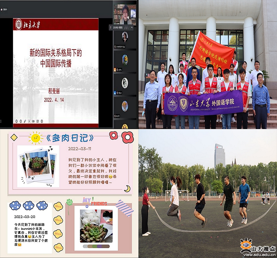 文体活动激活力。学院在严格遵守疫情防控要求的前提下,以学生组织、党团支部为依托积极开展丰富的文体活动。学院积极调集学术资源,举办云端系列学术讲座,每周2至3场,已组织8场学术报告,内容涉及俄乌局势、国际传播、学术写作、研究方法等,每场学术报告的听众均超过300人。此外,学院还举办绿植领养、“洪楼时光留声机”云歌会、“中行杯”外文节随机舞蹈洪楼站等多项趣味活动,为校园增添青春活力;举办运动嘉年华系列体育活动,包括“疫”起自律运动打卡、各式趣味运动以及羽毛球赛,鼓励同学们“走下网络、走出宿舍、走向操场”,增强体魄,以健康身心从容应对疫情的挑战;举办“中行杯”洪楼春日摄影大赛、“疫情下的青年担当”主题团日升旗仪式、“读原著、享美文”外文书法大赛、研究生文化交流微视频大赛等美育活动,丰富大家在校园封闭管理期间的课余生活,通过发现美好,传递爱、祝福与希望,激励学子们守望相助、共克时艰,更有信心、有动力度过抗疫难关。