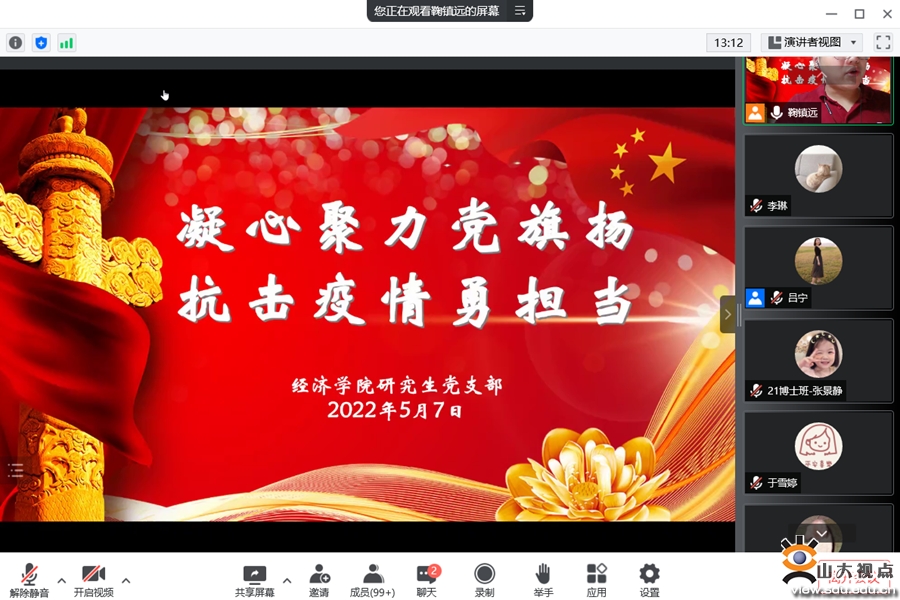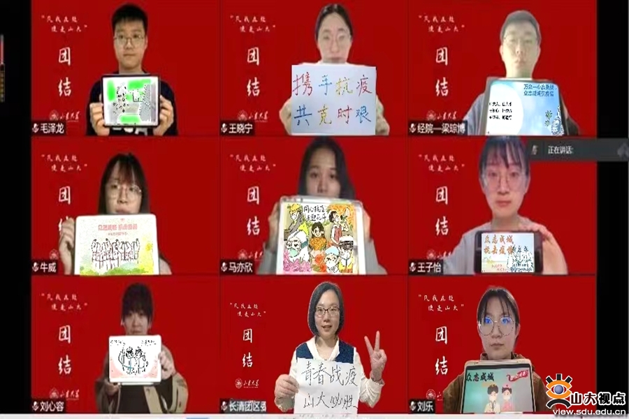 随后,通过学习“最美逆行者——张静静”和“春风吹百卉,爱永留人间——白晓卉”两位山大人感人至深的抗疫故事,以及长清青年扎根抗疫一线、无私奉献的优秀感人事迹,大家深切感受到“生命至上、举国同心、舍生忘死、尊重科学、命运与共”的伟大抗疫精神。隔离不隔爱,处于隔离期的学生们踊跃发言,分享“我与大白的暖心故事”,表达自己对隔离点防疫人员的感激与感谢之情。学生代表分享了自己在隔离期间的科研学习生活、考公就业的心得体会等,为大家提供了宝贵的经验。会议向各位党员发出《配合疫情防控工作的倡议书》,希望充分发挥学生党支部的战斗堡垒作用和学生党员的先锋模范作用。会后,师生代表同屏展示自己为山大加油的文字和绘画,传递正能量;全体学生党员重温入党誓词,铭记初心和使命。长清区相关领导、工作人员及学生党员参会。