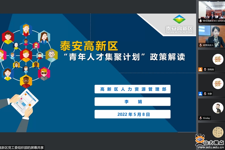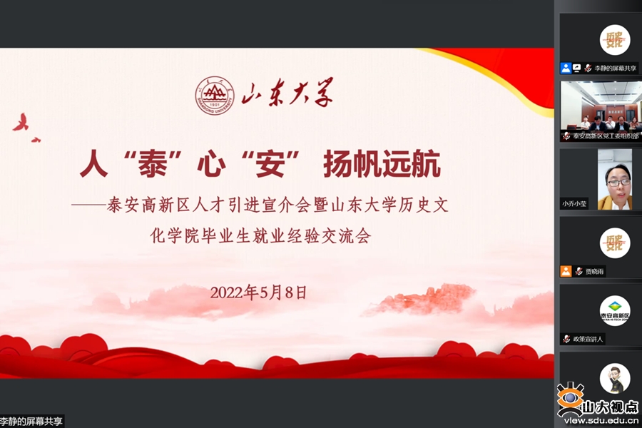 [本站讯]近日,泰安高新区人才引进宣介会暨山东大学历史文化学院毕业生就业经验交流会在线上举行。泰安高新区管委会科技副主任、齐鲁工大(省科学院)泰安成果转化中心主任琚伟,泰安高新区党工委组织部副部长、党支部书记李峰,党工委组织部人才办主任李娟,聚智人力资源公司总经理石东震;山东大学历史文化学院党委书记刘军、人事部副部长朱子川、学生就业创业指导中心副主任王迎春出席活动。