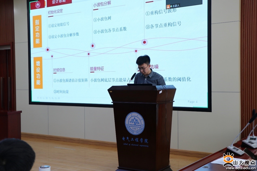决赛中,选手们按照顺序由本科生至研究生依次进行八分钟的作品陈述和展示,评审老师根据选手们的陈述和展示提出问题和建议,并给出最终作品得分。大赛采取了自由命题与指定命题相结合的参赛形式。其中,指定命题由山大电力技术股份有限公司的技术专家给出,旨在引导学生关注当前新型电力系统的实际需求,进入决赛的作品包括基于小波包的信号分析软件、文档比对工具、智能移动语音垃圾收集装置等。自由命题类作品涉及的范围比较广泛,有专注于软件开发的作品,如基于《山东省电力零售市场交易规则》编写的电价套餐推荐程序、基于STEPS的电力系统仿真软件设计等;也有实物制作的作品,如基于Arduino的低成本激光雕刻机、精细化分时分区的节能消毒锁鲜冰箱、一种基于STM32F4芯片的永磁电机在线反电动势测试仪等;还有学科交叉融合的作品,如介质阻挡放电低温等离子体降解阿维菌素实验与模拟研究、地球和火星气压下等离子体技术分解二氧化碳等。