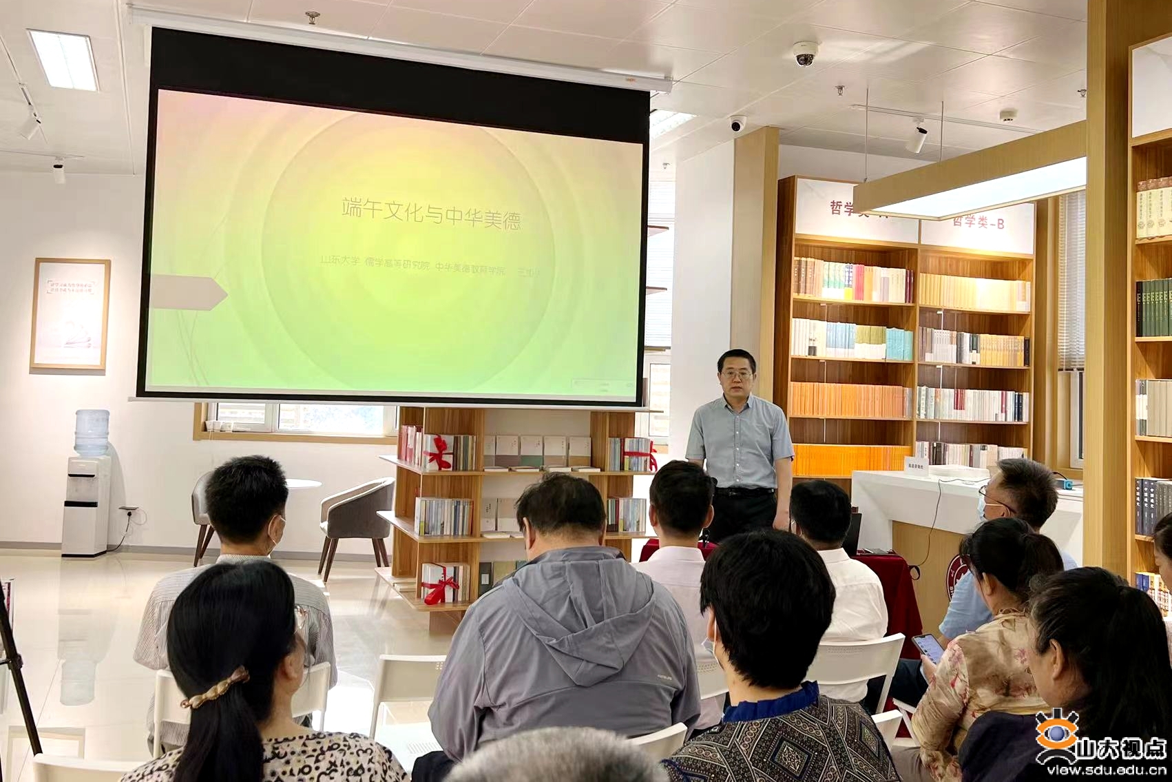 [本站讯]在端午佳节到来之际,为弘扬中华优秀传统文化,传承中华民族节俗,加强中华美德教育普及,发挥传统节俗的教化功能,6月2日下午,由山东大学中华美德教育学院、历城区文联、历城区文化和旅游局主办,稼轩文化交流协会、文史哲阅读馆承办的“端午文化与中华美德”主题讲座,在历城文博中心文史哲阅读馆举行。山东大学儒学高等研究院兼中华美德教育学院党委书记李平生、山东大学儒学高等研究院副院长王加华、历城区慈善总会会长孙德顺,以及中华优秀传统文化学习爱好者约200人,通过线上线下相结合和的方式共同参加了本次活动。历城区稼轩文化交流协会会长王海峰在现场主持讲座。