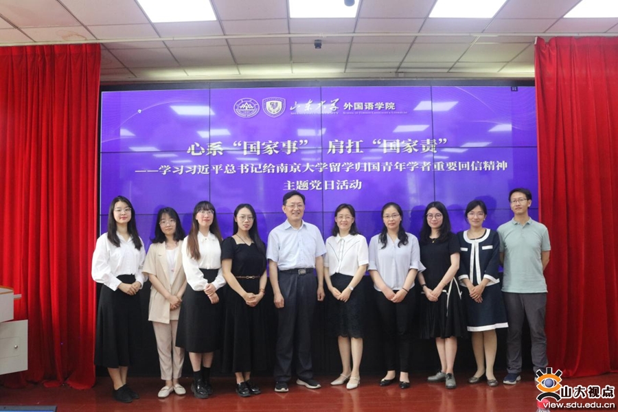 [本站讯]为深入贯彻学习习近平总书记给南京大学留学归国青年学者重要回信精神,外国语学院党委于6月2日组织“心系‘国家事’ 肩扛‘国家责’”主题党日活动。活动邀请董记华、张聪、李月珊、薛琳和冯伟五位留学归国学者作为访谈嘉宾,分享学成归国后投身教学、科学、国际合作交流等方面的成果与收获。学院党委书记薛佩军参加活动并讲话,学院党委副书记刘华主持活动。