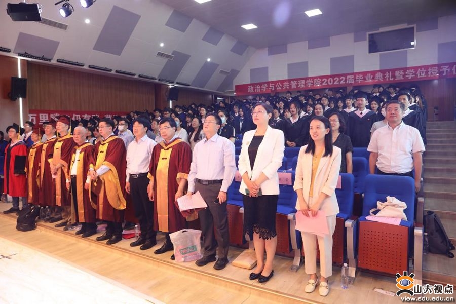 在学位授予仪式环节,政管学院学位评定委员会委员马奔教授、刘玉安教授、王建民教授、刘昌明教授、孔新峰教授、黄登学教授为毕业生授予了学位证和毕业证。伴随着悠扬的山大校歌,本次毕业典礼暨学位授予仪式顺利结束。