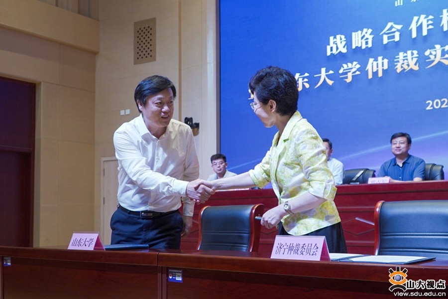 仪式上,邢占军、李海洋为“山东大学仲裁实践教学基地”揭牌;山东大学法学院院长周长军,狄峻青代表双方签订了战略合作框架协议。山东大学与济宁仲裁委员会战略合作框架的签署和山东大学仲裁实践教学基地的建立,有助于双方在科研合作、人才交流、业务培训等方面深度融合,实现优势互补,共建共赢。法学院将立足学科特色,深化供需对接,构建与法学学科专业密切结合的市场拓展工作体系,围绕仲裁开展学生实习实践,拓展新的学生就业渠道。