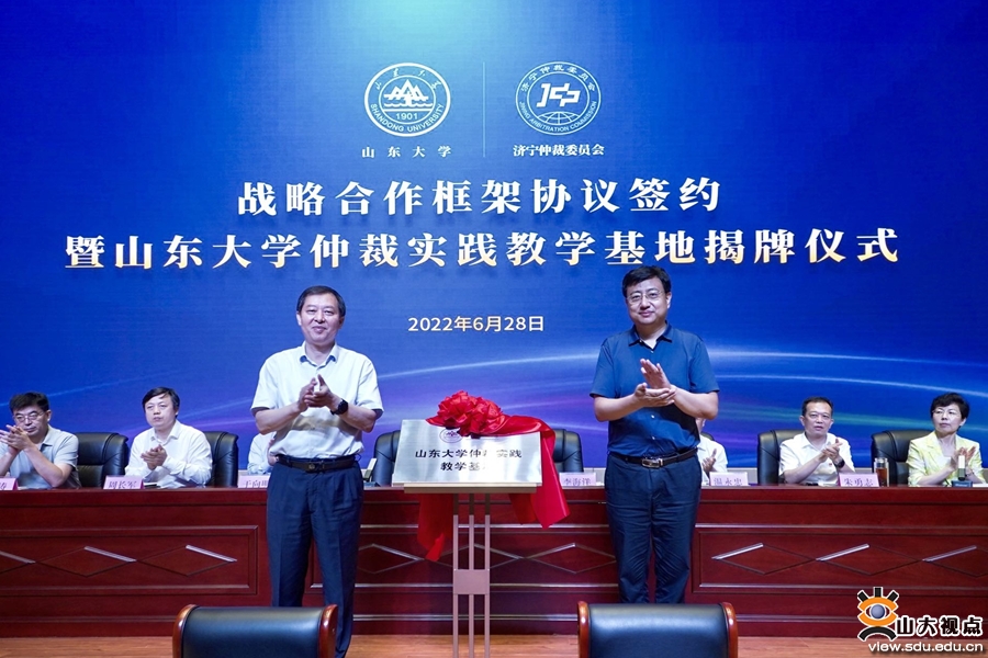[本站讯]6月28日,山东大学与济宁仲裁委员会战略合作框架协议签约暨山东大学仲裁实践教学基地揭牌仪式举行。济宁市副市长、市公安局党委书记、局长、济宁仲裁委员会主任李海洋,山东大学校长助理、青岛校区党工委常务副书记邢占军出席仪式。仪式由济宁市仲裁委员会办公室党组书记、主任狄峻青主持。