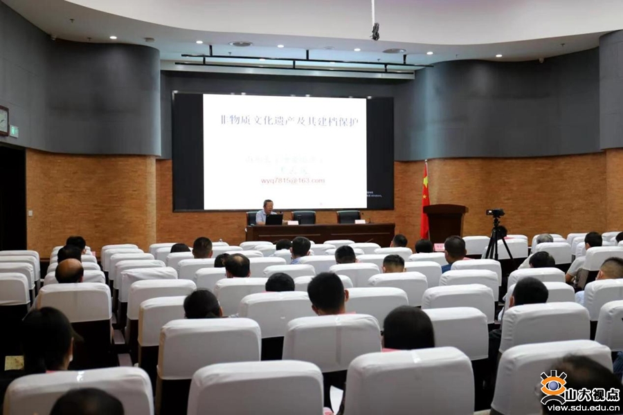 仪式结束后,山东大学教授、博士生导师王云庆为济宁市市直相关部门负责人,各县市区档案局局长、馆长,市城建档案馆馆长作题为“非物质文化遗产及其建档保护”的专题讲座,讲座由杜宏春主持。