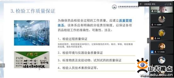 正大天晴药物研究院副院长张寅生通过对比标准新药发现,介绍了以AI技术为基础的创新药研发过程与管理。山东省食品药品检验研究院党委书记李军结合实际案例,对药品检验机构组织的架构与工作程序、药品质量标准、药品的风险识别与控制进行了详细介绍,加深了同学们对药品检验工作的理解。吉林大学第一医院药学部主任宋燕青结合国家对药学服务和药师需求的政策背景,介绍了当今药学服务模式已逐渐从“以药品为中心”转变为“以病人为中心”,从“以保障药品供应为中心”转变为“在保障药品供应的基础上,以重点加强药学专业技术服务、参与临床用药为中心”。山东大学药品监管科学研究院副院长臧恒昌以国外和实验室的具体案例向同学们详细讲授了药品连续制造的实时评价与放行技术,使同学们从工业化生产的角度对药品制造有了更加深刻的认识。上海医药工业研究所研究员周伟澄详细讲解了专利在药品研发中的地位与作用以及新药研究申请专利策略,扫除了同学们专利申请相关知识的盲区。山东大学公共卫生学院左根永副教授围绕药事管理与法规内容展开,深入浅出地介绍了药品市场准入流程、药品注册管理的基本制度和要求内容。