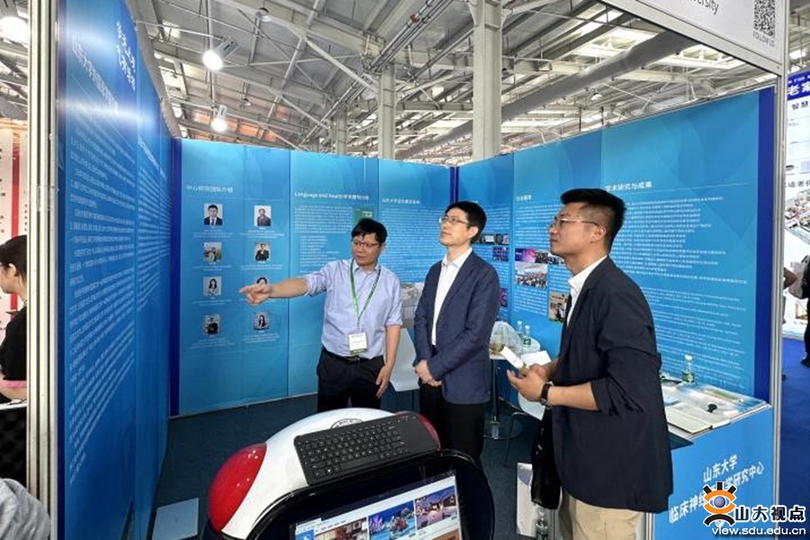 会展期间,作为受邀参展的八所高校之一,山东大学临床神经语言学研究中心展位重点对外国语学院及“临床语言学”学科建设、团队建设、人才培养、科研成果、社会服务等成果进行了展示,并带领参观者体验临床语言学研究的转化成果——基于汉语儿童社交沟通能力评估与干预的VR评估与康复训练仪。展位吸引了来自国内外数百位来自医院、高校、科研院所、康养机构的观众。与会观众对山东大学在新文科背景下创设的文医交叉的“临床语言学”特色学科表现出浓厚兴趣,并有企业、医院、机构等表达进一步的合作意向。