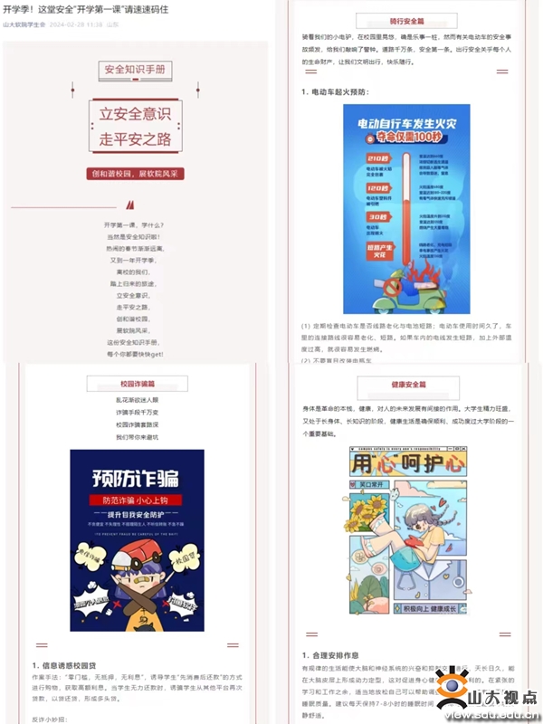 各年级召开专题会议、年级大会、主题班会、党支部会议等,线上线下相结合,人员全覆盖,围绕法律法规与校规校纪、校园消防安全、流行病防治、反诈骗等方面进行安全教育,并组织观看《生命重于泰山》《红线》等宣传教育片,使安全意识深植每一位同学内心。依托学院学生会公众号,以图文并茂、生动活泼的形式,发布安全“第一课”相关推文,进一步加强安全宣传,做好新学期宿舍安全、骑行安全、财产安全、健康安全提醒。