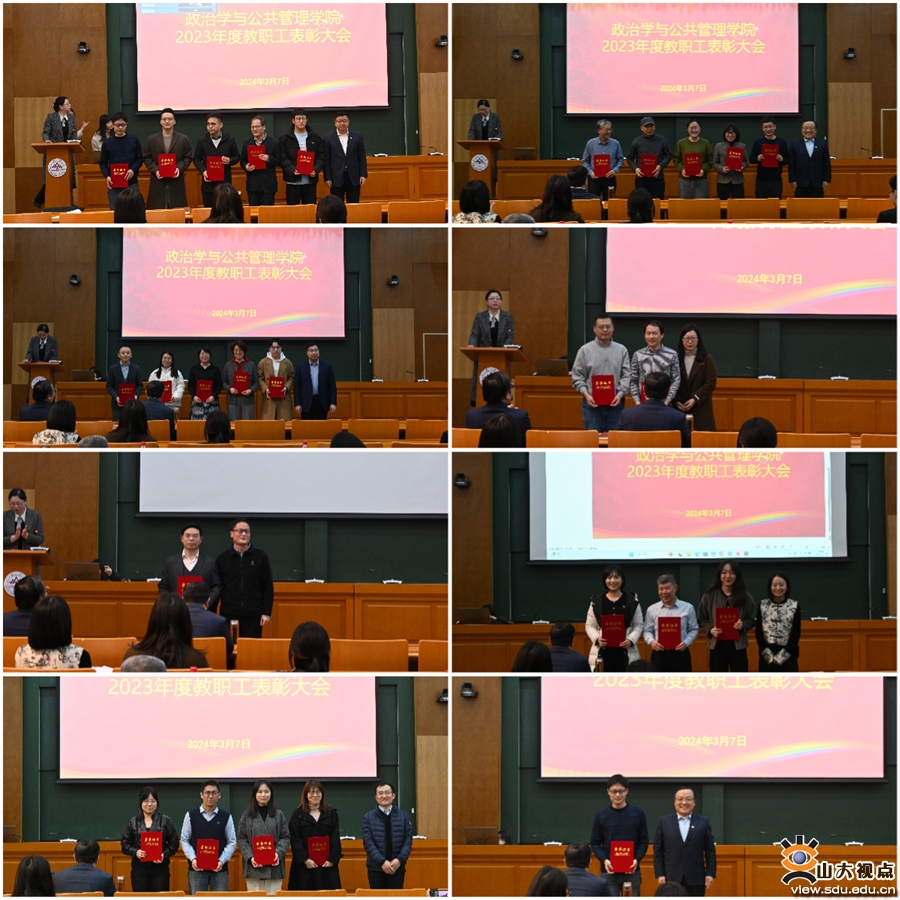 学院2023年度教职工表彰大会隆重表彰了在教书育人、科学研究、管理服务工作中涌现出来的先进集体和个人。学院党委副书记石莹主持表彰大会。大会依次颁发了优秀教师奖、优秀共产党员奖、先进教育工作者奖、优秀党务工作者奖、科研突出贡献奖、文体活动突出表现奖、MPA年度优秀教师奖、MPA年度优秀教育工作者奖以及先进基层组织奖。会议强调,全体教职工要以先进典型为榜样,凝心聚力,开拓进取,以更加奋发有为的精神状态,真抓实干的工作作风,在学校“全面图强、争创一流”的新征程中发挥更大作用。