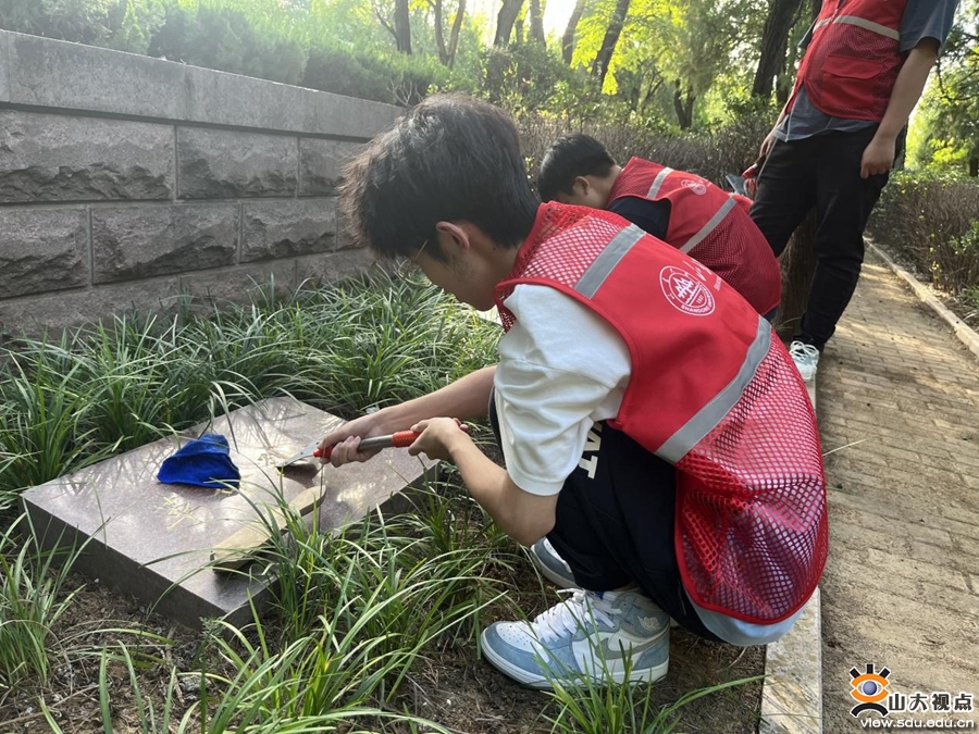 缅怀革命先烈,坚持砥砺前行。为表达对先贤烈士的无尽敬意,传承革命精神,学院青年志愿者前往济南历城革命烈士陵园,组织20余名志愿者开展烈士陵园清扫志愿服务。志愿者们分小组行动,各司其职,清理墓前落叶落果,于墓碑前描金。寥寥数笔不足以勾勒出战士们壮怀激烈的一生,但足以让志愿者感受到他们忠贞报国的英雄气魄和胸怀,点燃志愿者心中的红色记忆,唤醒在血脉中烙印的红色基因。