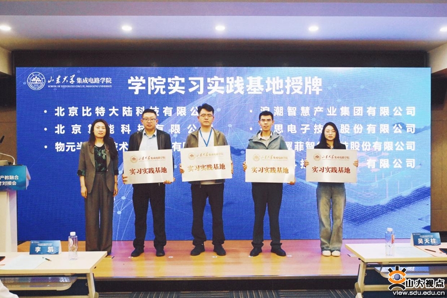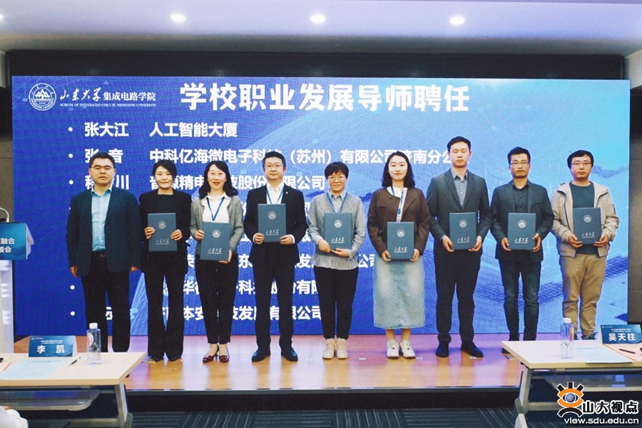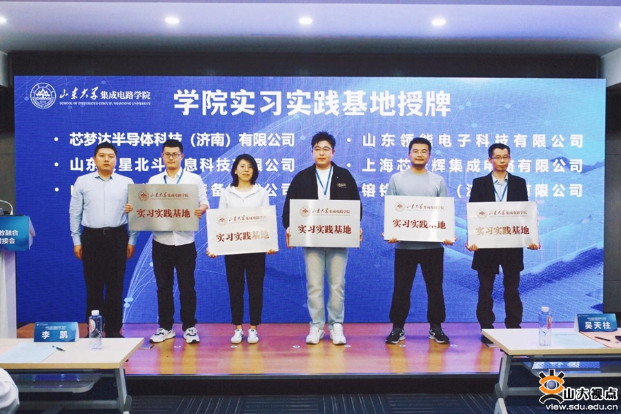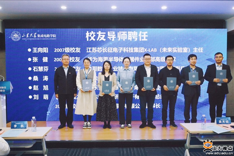 开幕式上,浪潮数字企业人力资源部副总经理石慧芬分享了企业在人才引育方面的宝贵经验和典型做法。王震为7位优秀校友颁发“山东大学校友导师”聘书,周庆华为16位企业导师颁发“山东大学学生职业发展导师”聘书,马毓轩和陈诚共同为学生实习实践基地授牌,马毓轩为集成电路学院“芯企航”社会实践队授旗。为进一步加强校企合作的深度与广度,为未来的共同发展注入新的动力,活动现场还举办了“AiP知识产权赋能IC双创基地”“山东大学-普源精电联合创新平台”“山东大学芯梦达先进存储芯片设计与测试工程研究中心”“创客导师之家”和“芯启航生涯工作室”揭牌、签约仪式。