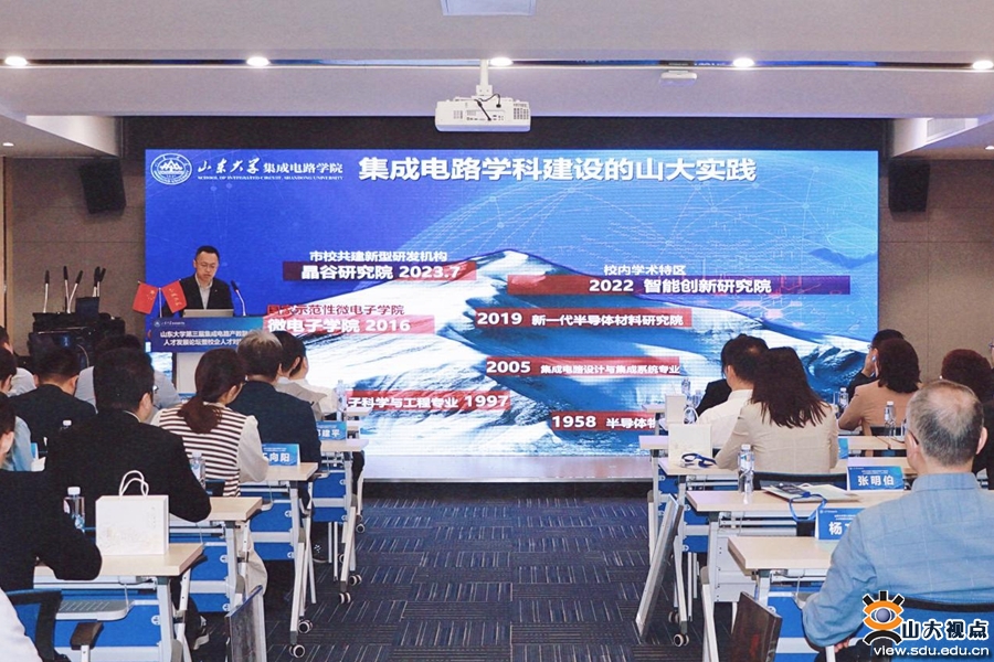 [本站讯]4月14日,山东大学第三届集成电路产教融合人才发展论坛暨校企人才对接会在软件园校区举行。国家信息通信国际创新园服务中心副主任、齐鲁软件园发展中心主任李凯,山东大学集成电路学院(济南晶谷研究院)党委书记吴天柱,创新创业学院执行院长邢建平,校团委书记马毓轩,校友工作办公室主任王震,学生就业创业指导中心副主任周庆华,服务山东办公室、合作发展部副部长陈诚出席活动。