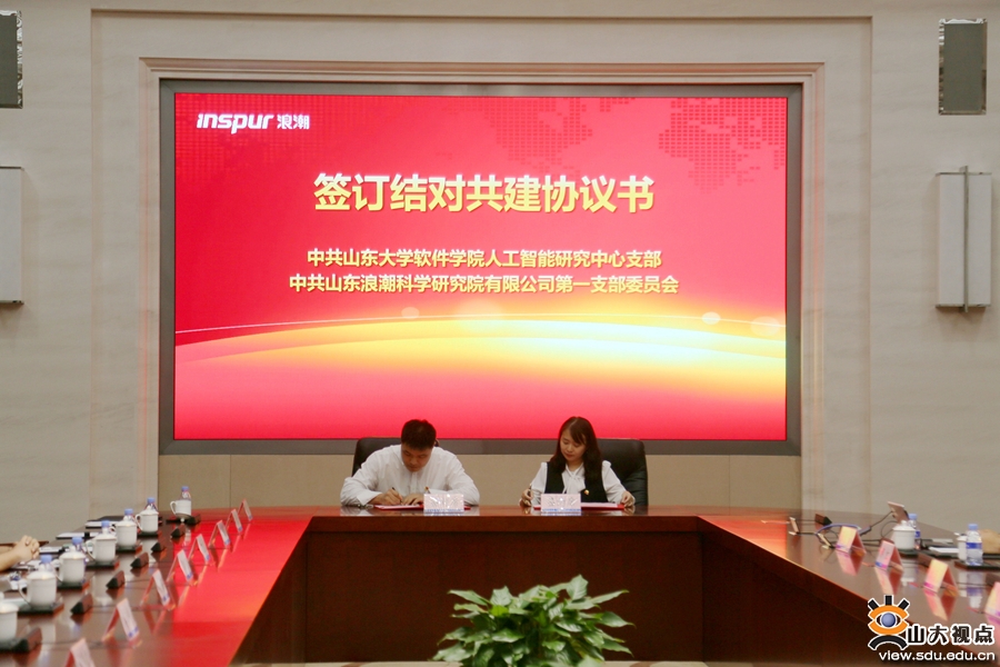 会上,孙玮茄、魏子重分别代表山东大学软件学院党委、浪潮科学研究院总党支签订了党建结对共建协议书,戴鸿君、王芳分别代表软件学院人工智能研究中心党支部、浪潮科学研究院第一党支部签订了党建结对共建协议书。