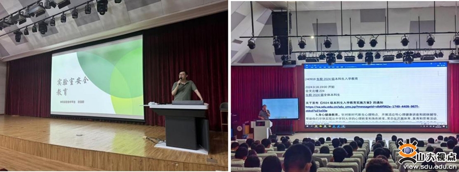 开展教育培训,提高应对能力。学院党委副书记李汉烨对学院2024级全体新生进行法规法纪及安全教育,结合多个典型案例,强调要增强安全意识,自觉遵守法律法规、校规校纪。学院实验室安全管理员温廷婕、学院本科实验教学平台杜海舰分别面向2024级研究生、本科生开展实验室安全培训,讲解了山东大学实验室安全规定以及实验室常见安全事故的识别与处置方法。学院2021级本科生辅导员孙圣杰主持心理委员、宿舍长培训讲座,从宿舍安全角度出发,树牢心理委员和宿舍长的岗位责任意识,提升履职能力。学院举办防诈骗知识讲座,邀请青岛市公安局即墨分局反诈骗专家为研究生进行防诈骗安全知识讲解。
